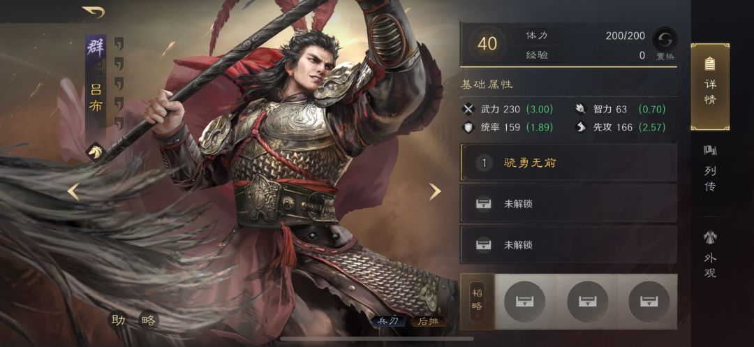 吕布:带“辕门射戟”“兵贵神速”,“辕门射戟”。加点30速后全武力,在保证一定速度的基础上,最大化武力输出。