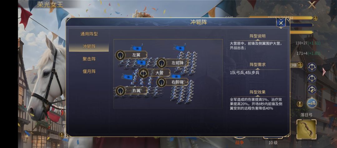 再看弓兵,白衣女王的技能“全体每5秒恢复10(+1)%兵力”,技能确实非常符合冲轭阵,但偏偏白衣女王没有冲轭阵的阵型……