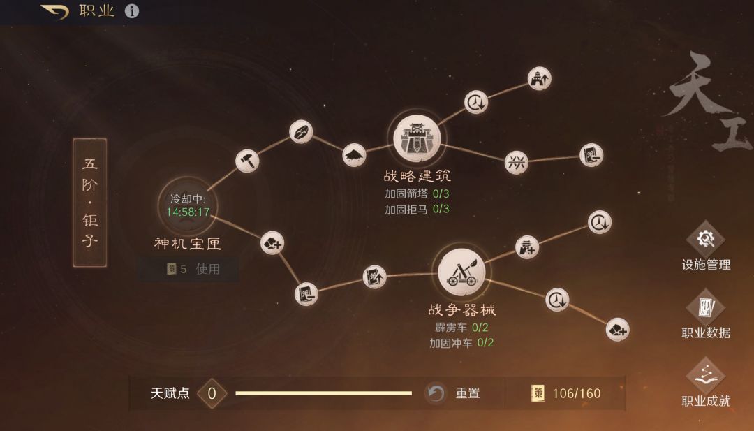 天工:每天可以额外打造装备,职业特技建造拒马、箭塔、投石车、冲车等战争器械