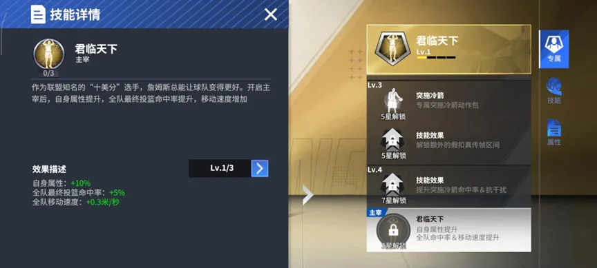 开启主宰后,球场理所应当成为了詹姆斯的地盘——自身属性增加10%,全方位无死角提升完全挑不出詹姆斯的短板;全队最终投篮命中率提升5%与全队移动速度增加0.3米/秒,全民皆兵,跟随你们的皇帝向着最后的胜利冲锋!
