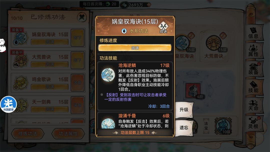 这里有个小调整,在通过实测发现,【凤里栖】的专属技能【娲皇御海诀】伤害与【天一】相比几乎不相上下,而四阶材料又太少,因此可以选择做个三阶水竹主材料,一阶水叶子技能的覆天法宝。既能够让技能吃到水系加成,还能够让【千叶迎秋】吃到水系加成。因为【松风】让【阿璃】带了,【凤里栖】可以同时带【天一、娲皇】打出最高伤害,当然如果生存有压力,也可以换成【山海、娲皇】,给自己增加一层保障。