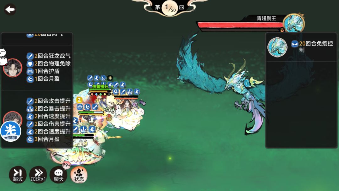 可以看到,卫寒在第二回合开始时头上几乎没太有buff,但是三速【凤里栖】释放完技能后会紧接着释放【炼石补天】,四速【卫寒】动之前头上又有了【伤害提升】效果。