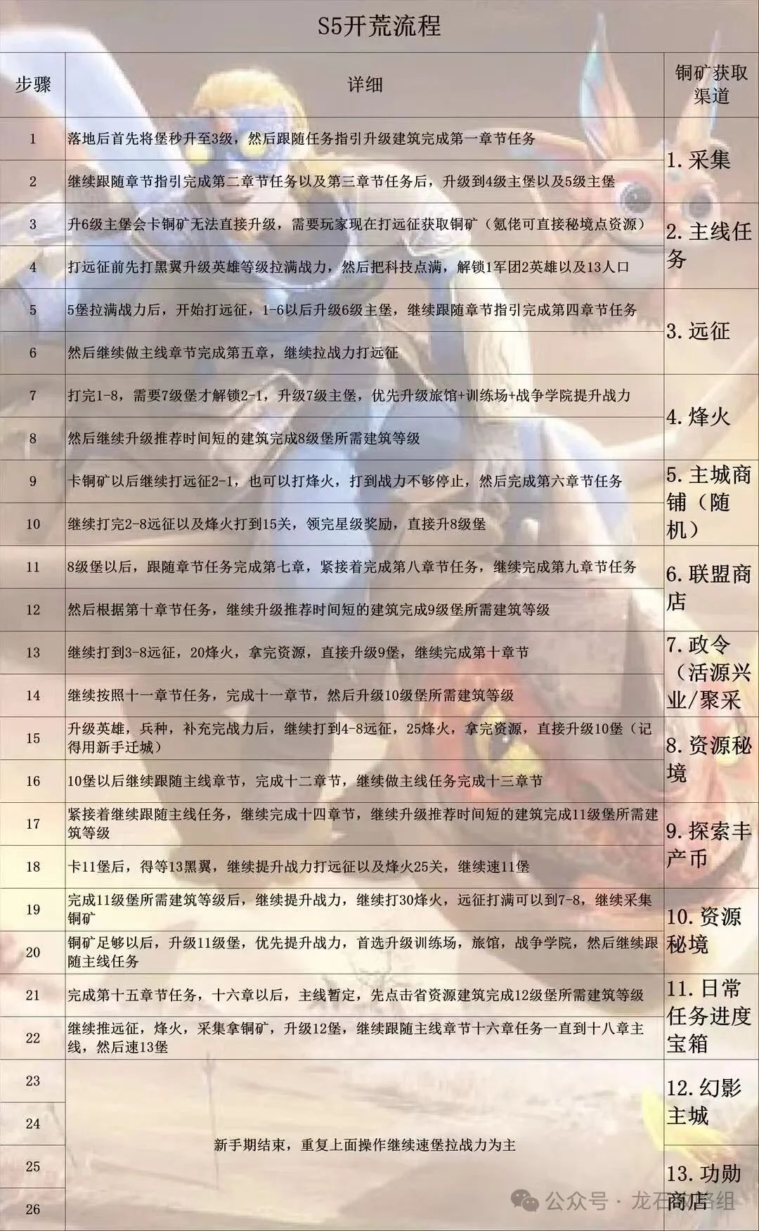 本期给大家带来S5开荒攻略包含流程,开荒队伍推荐,建筑点法