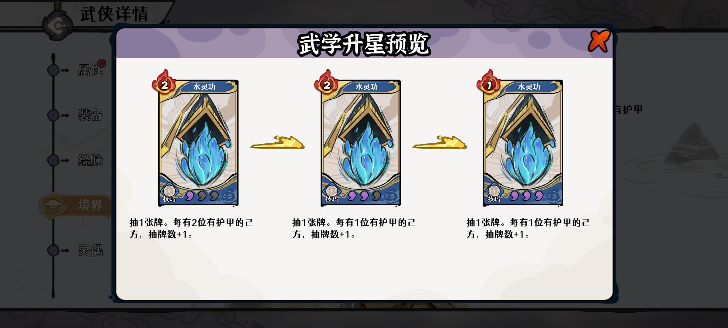 灵儿的武学基础怒气为1抽取1张卡牌,我方每有一个人有护甲可多抽1张牌。由于蛤蟆需要带降龙套和镇岳靴,且配卡不携带防御牌,因此想要达成1怒抽5有以下三种解决方案:①4星蛤蟆被动提供初始护甲 ②装备词条携带一条初始护甲 ③幻境内神秘人或宝箱选取一次10%初始护甲。但是本身卡组的过牌手段较多,因此灵儿的武学并非刚需,仅仅是锦上添花,不必强求。