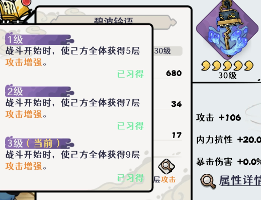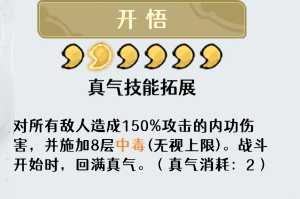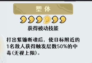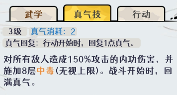 紫镰的真气技能可以给予全体敌方8层中毒,虽然可以超过上限,但多作为初始毒手段使用。要注意的是,战斗开始时回满真气的效果是紫镰2星的真气强化,因此在前文中要求紫镰2星启用。