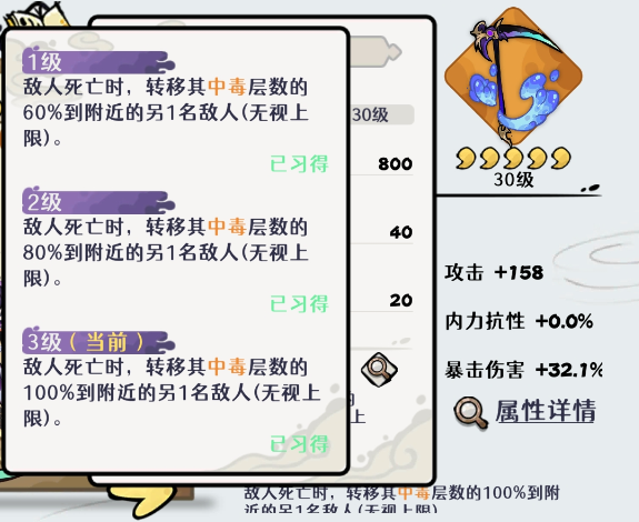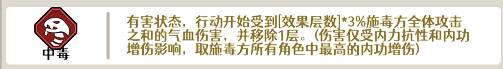 伤害计算:全体武侠攻击总和×3%×中毒层数×触发层数×(1+内功增强)×(1-内功抗性)