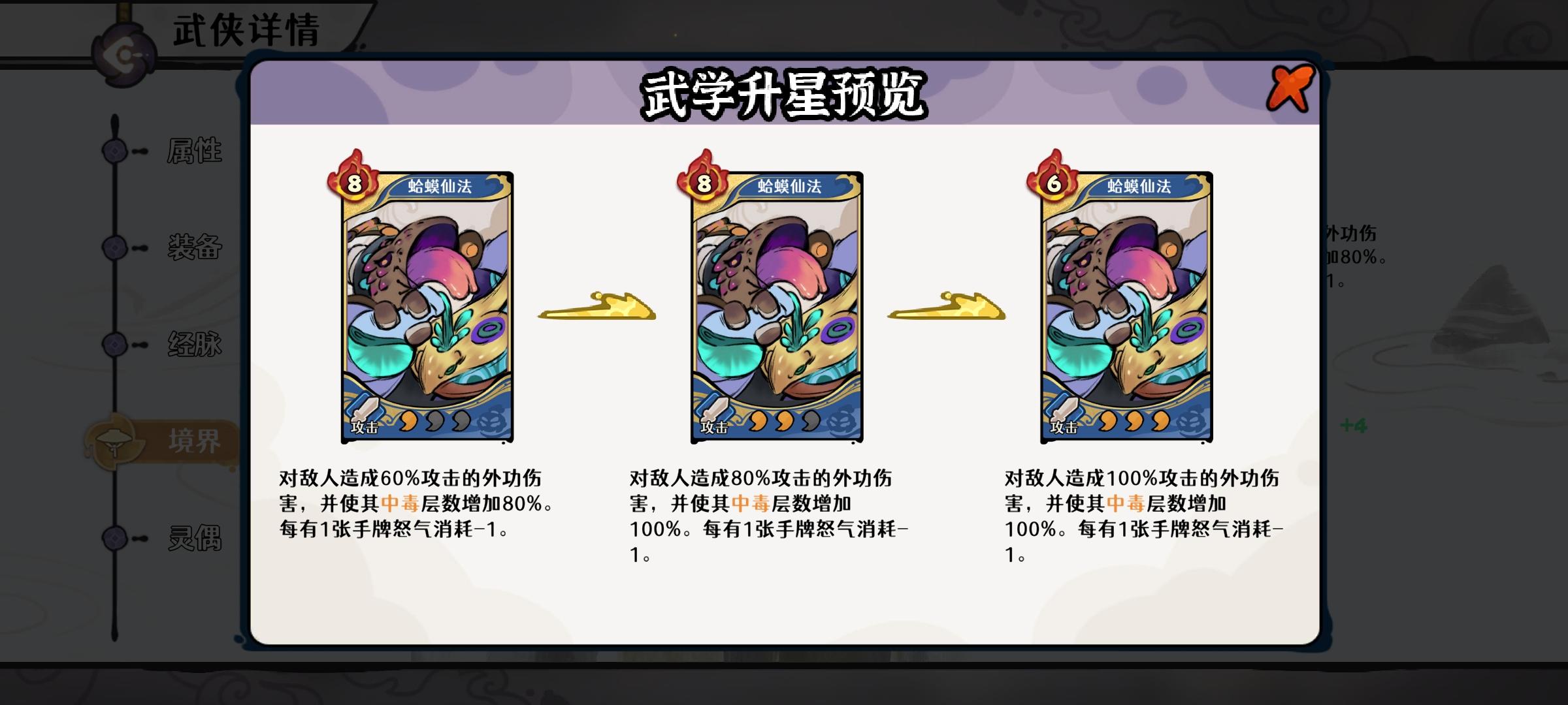 - 三张武学卡全部上手,则臭脚位10+8+4=22层初始毒,对该敌方单位打出万毒手后找两张蛤蟆武学完成启动。