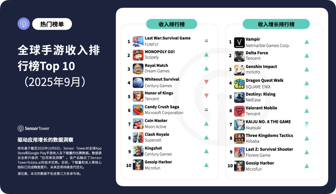 就在刚刚(2025/10/14/10:31),Sensor Tower发布了《2025年9月全球手游收入与下载量排行榜TOP10》。