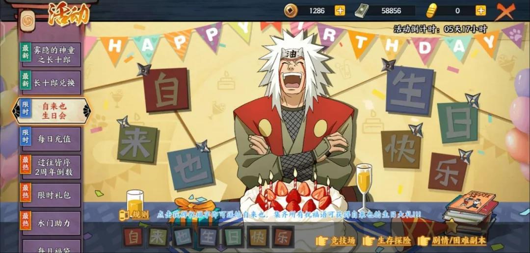 ⭐活动描述:活动期间,参与剧情/困难副本、竞技场、生存探险活动,有机会掉落祝福字“自”“来”“也”“生”“日”“快”“乐”。赠送并点亮所有祝福字,可获得自来也的生日礼包,不要错过哦~>>>通灵兽追打试训