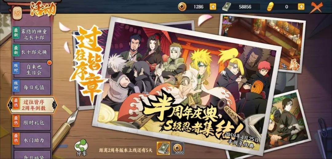 ⭐过往皆序,周年倒数!11月12日我们即将上线2周年五影会谈版本,细数过往走过的版本历程,一起倒数迎接12日新版本的到来,成功分享倒计时图片即可领取奖励。>>>自来也生日会