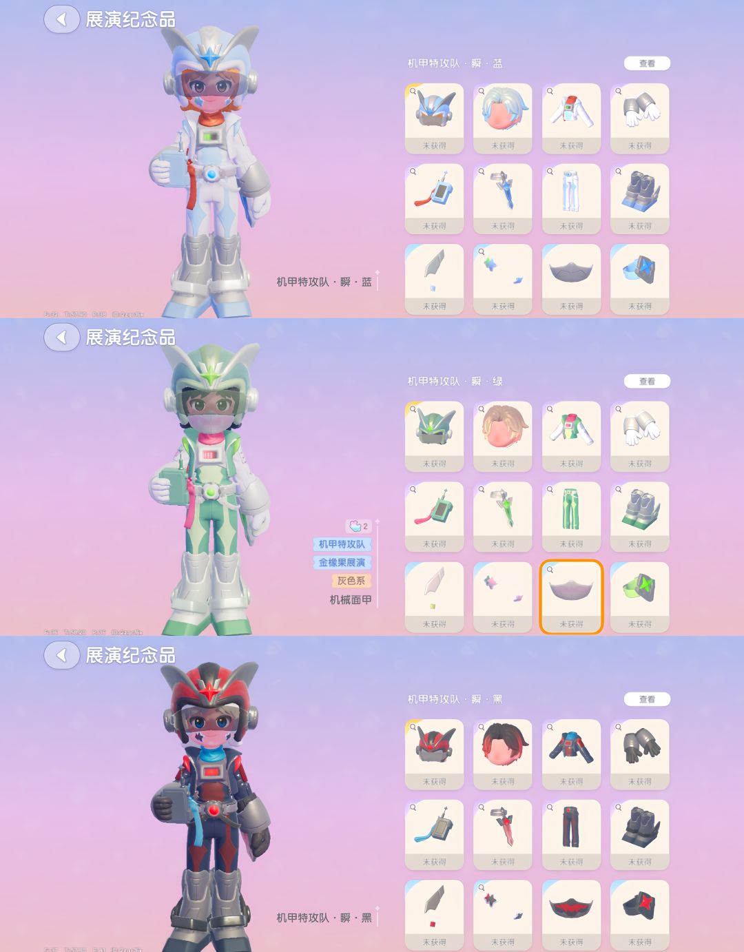 【机甲特攻队 战】有蓝、粉、黑三个颜色,【机甲特攻队 瞬】有蓝、绿、黑三个颜色。