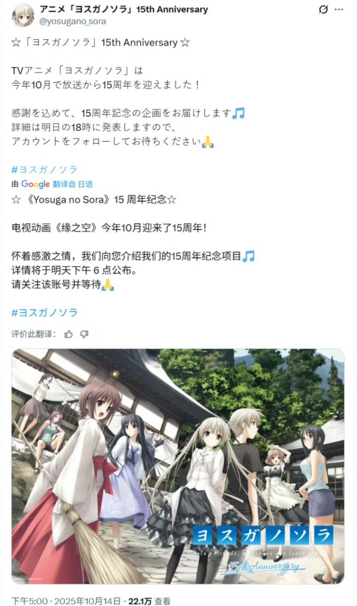 15周年纪念企划就要公布咯,真的超级期待。不知道这次会有什么惊喜,是出周边、新的动画内容,还是有重制计划呢?当年追番的我们,如今都有了不同的生活,但《缘之空》带来的感动依旧在心底。