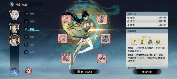 这里强调一下,灵屏和剑匣由于套装单件并没有给予150%+200%的属性,所以基础数值很高,即便是只有附灵效果的白板情况输出也不差(甚至比套装紫薇强)
