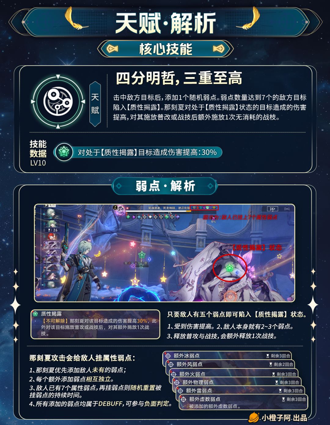除此之外,敌人拥有至少5个弱点时,还会使目标陷入【质性揭露】状态,受到伤害提高且对其释放普攻/战技还会额外释放1次战技。