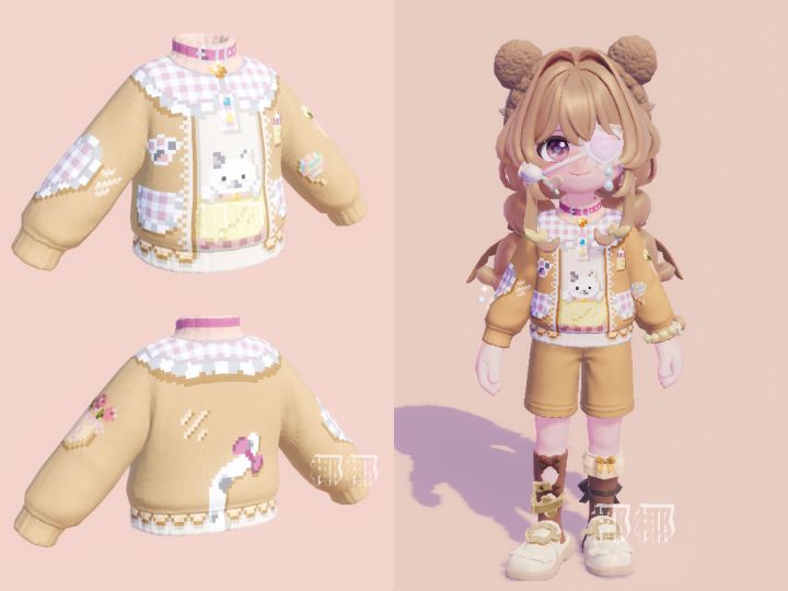 这个作品我围绕了“开心”、“害羞”这两个心情创作,我把小猫画在了衣服上,感觉是开心是治愈的,看见小猫仿佛一切坏心情都消失了,使用了粉色浅黄少量蓝色点缀,粉色较多也符合害羞这个主题比较适合约会穿搭。