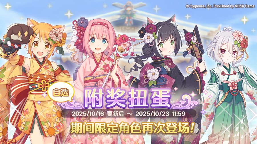 附奖扭蛋中,期间限定角色★3「优衣(新年)」、★3「日和莉(新年)」、★3「可可萝(新年)」、★3「凯露(新年)」将再次登场并作为「精选候补角色」出现!请不要错过哦~