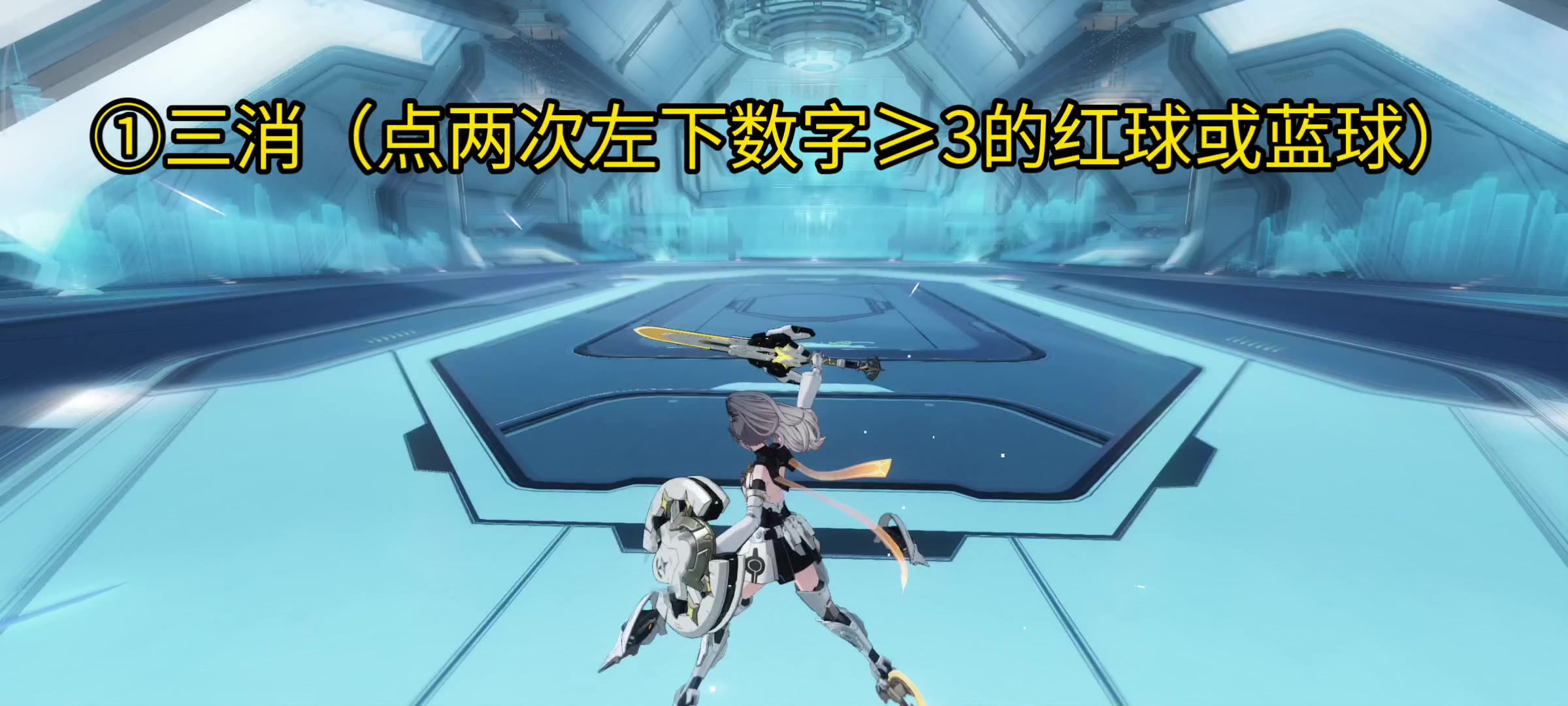 重复流程:三消→长按普攻→蓝球→大招(若此时大招未亮,就再三消一次)→长按闪避→消6次白球→长按闪避→二段大