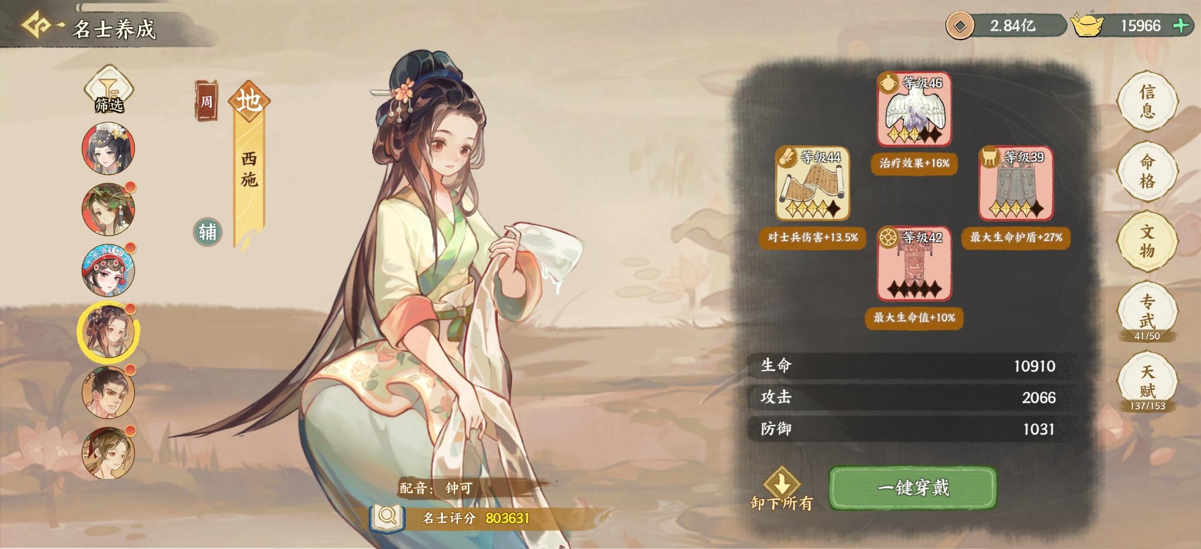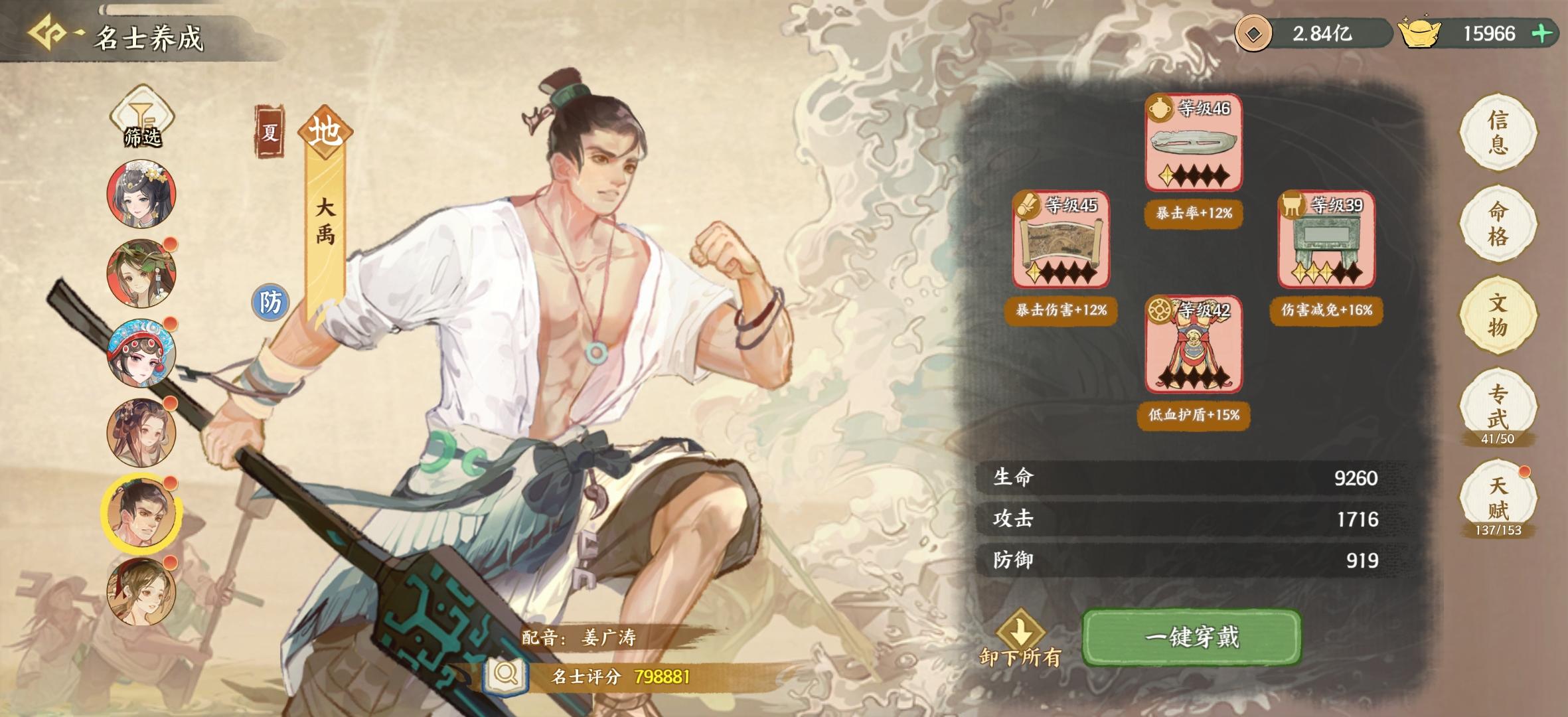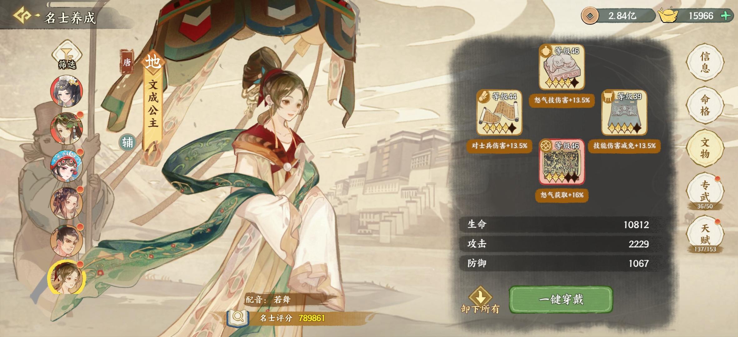最后,名士天赋方面,优先升级嫦娥,嫦娥天赋跟着等级升满,其他的名士平均升。