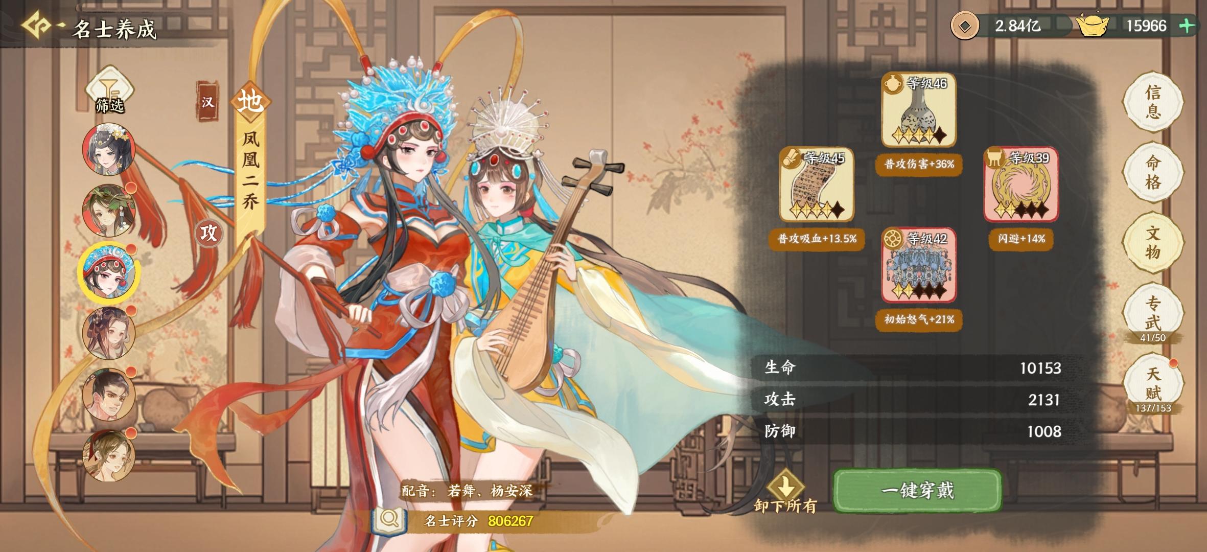 凤凰二乔,陶瓷玉器带官窑镂空瓶,书法字画带祭侄文稿,奇珍异宝带凤冠,开局先挂上增伤,金银铜器随意带个闪避。