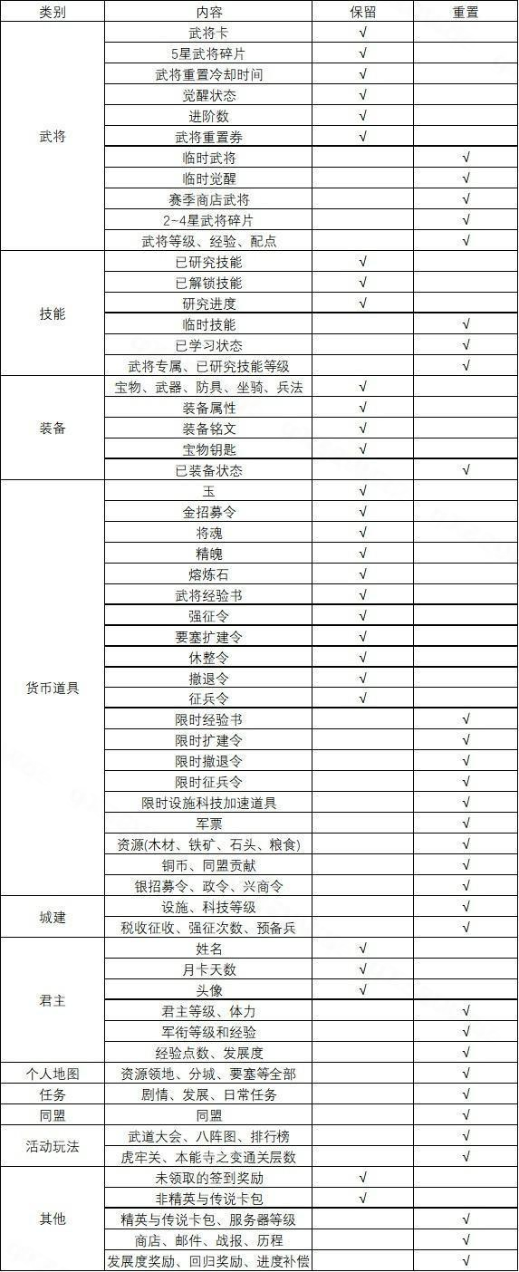 2.对君主在设施、科技、武将等养成方面(全新赛季重置部分)进行结算,如: