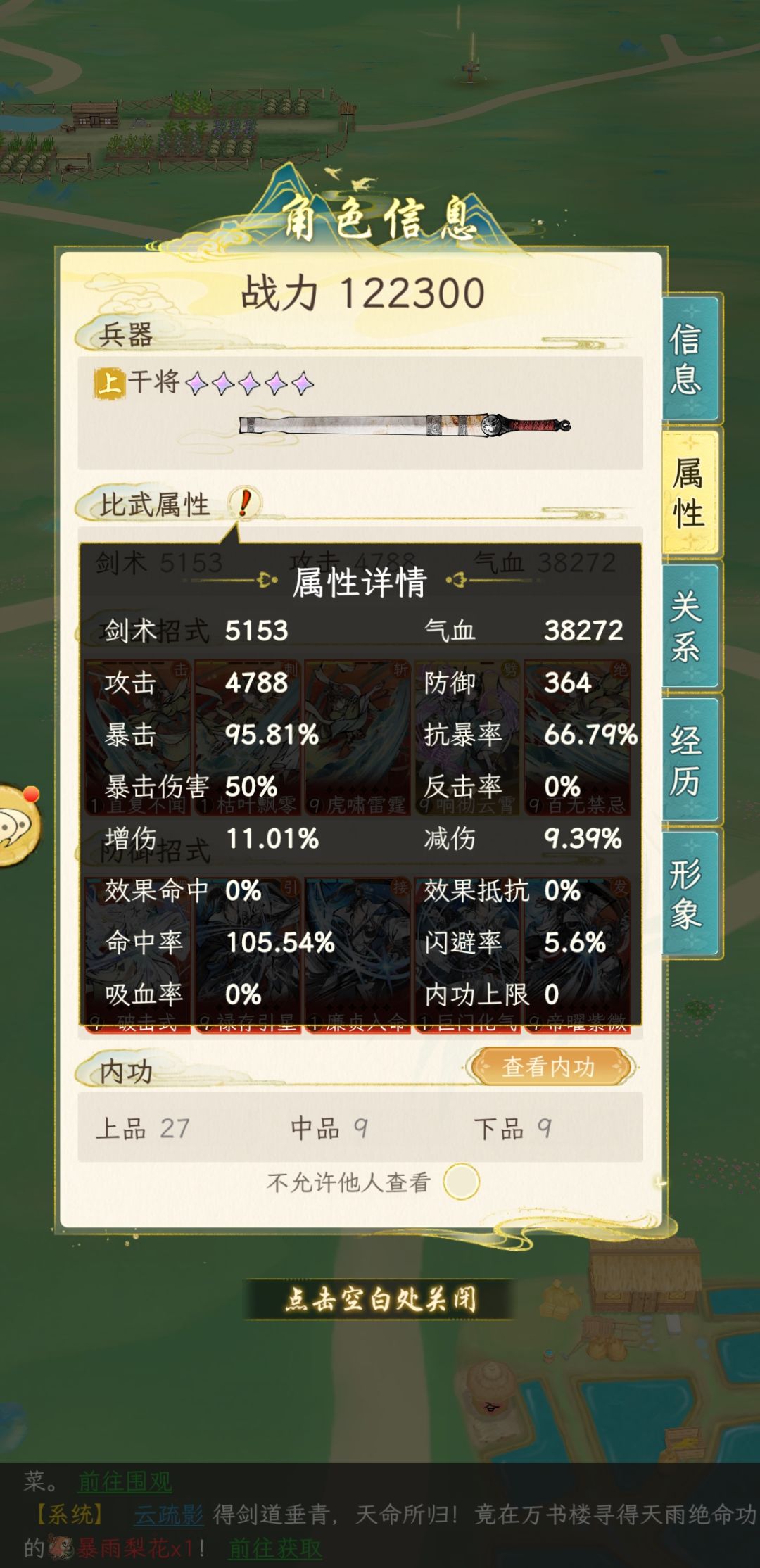 内功:太极剑(削了,还能用)鹰眼(削了,也能用,前面两个图用不到,中原必带)其他的发图了。