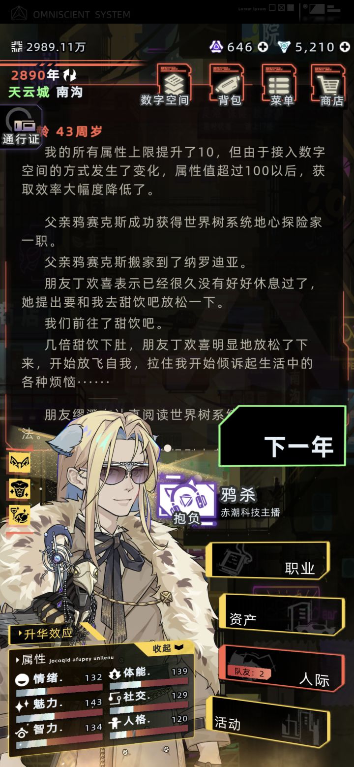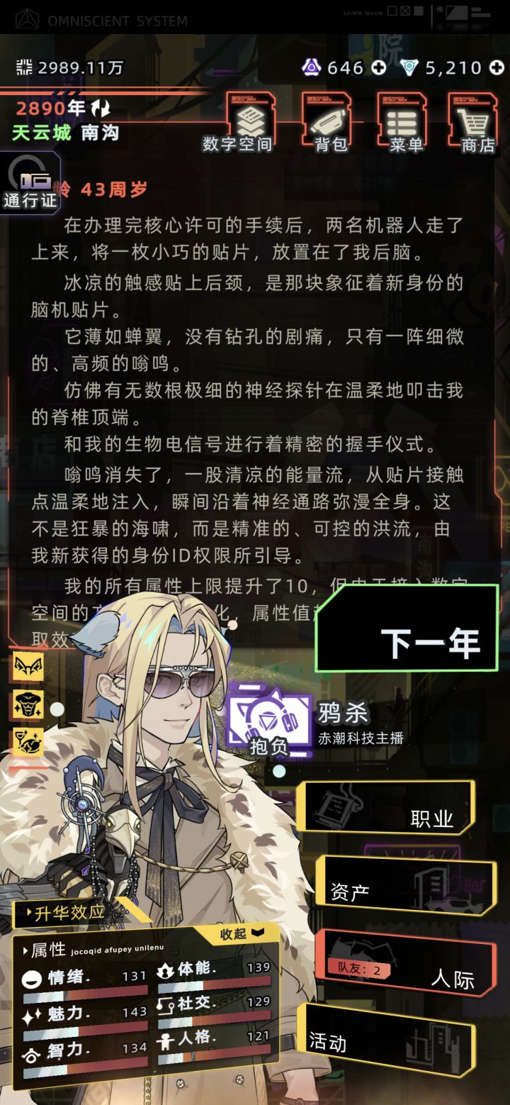 在这里跟新人说一下,要么买礼包拿上学天赋,12岁以后免费上去学习。要么多看骇客电影➕就业几年把芯片等级升上去,然后自费去学习。要么像我这样数值超标自动开通道。前两者如果毕业后不买飞鸟区的许可,上升通道会关闭,自己的家人会陷入考试的无限流里,哪怕毕业了他们也只能回下层继续上破班。后者飞升的通道是一直开着的,如果主控不想上去也可以不上去,但主控的家人就不用无限流了,他们包苟富贵必相忘的,跑的比谁都快。