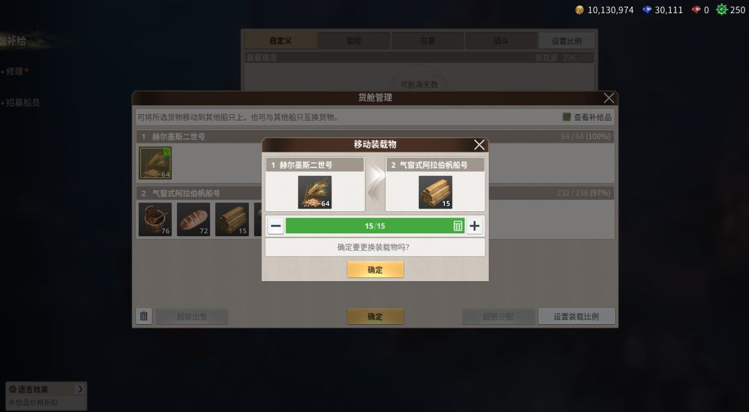 此外,还可补给修理船只所需的物资、炮击消耗的炮弹。补给时可通过界面功能精准管理物资,避免浪费或短缺: