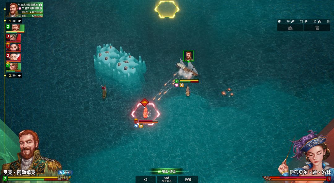 - 炮击:消耗炮弹进行远距离攻击,对敌方船只造成耐久度伤害;若在敌方炮击射程内发动,敌方会发起反击;我方船员体力过低时,炮击伤害会减少。