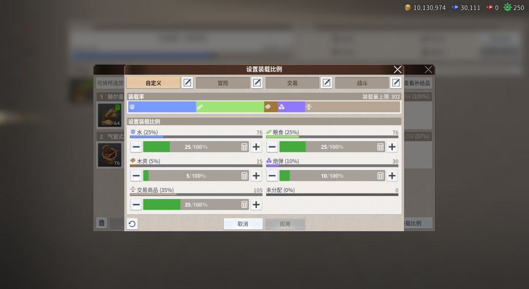 ① 比例设置:自定义各类物资、贸易品的装载比例;也可修改 “冒险”“贸易”“战斗” 等预设配置的名称与详细比例,适配不同航行目的。