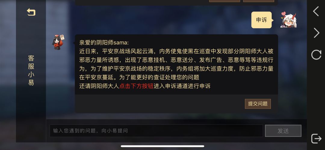 当大人们在平安京里遇到影响公平竞技的不良行为时,可以善用举报系统进行反馈,和牙牙携手维护平安京战场的良好秩序!如受到违规处罚的大人们对系统判定结果持有异议,各位大人也可以向内务组提起申诉,经查证后,将有机会撤销处罚。