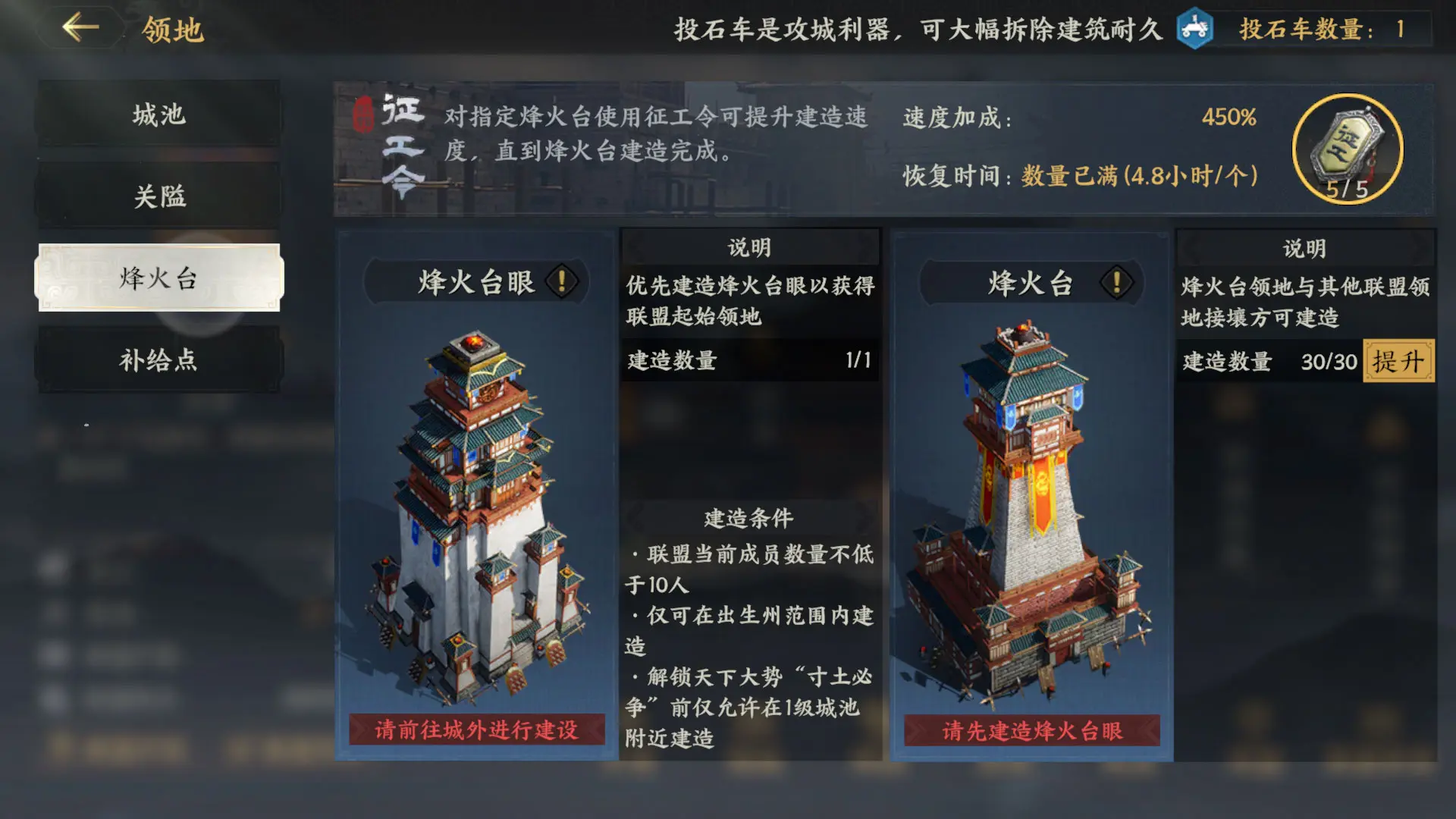 1.铺路:从烽火台眼出发,通过建造烽火台向目标城池推进,烽火台眼可在出生州任意1级城池附近建造。