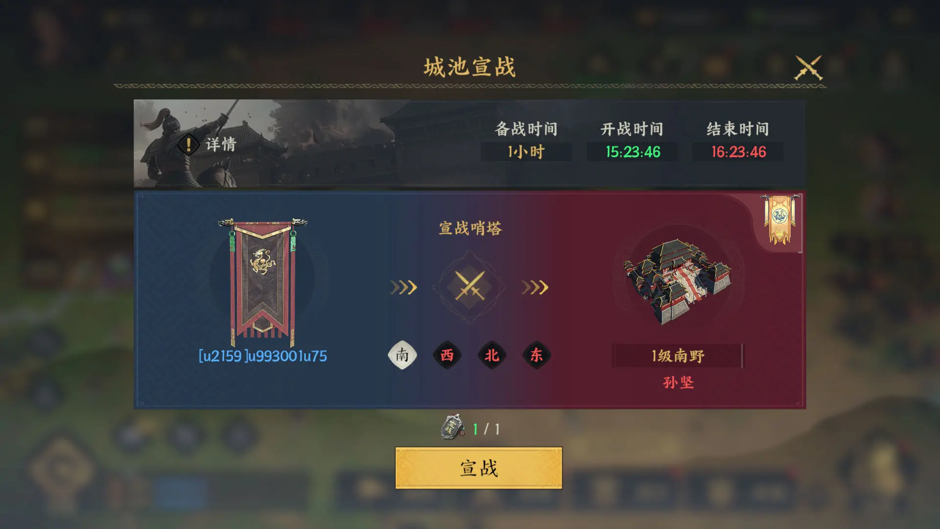 4.准备:宣战后有1小时准备时间,可将部曲派遣至城池哨塔,届时可自动攻打宣战目标。