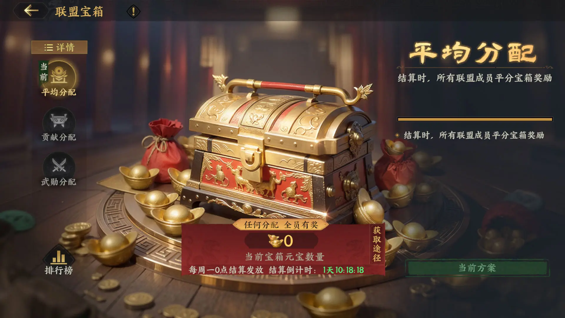 3.联盟宝箱:联盟每周根据联盟声望和联盟拍卖获得元宝,盟主可以根据成员的贡献度或武勋进行分配。