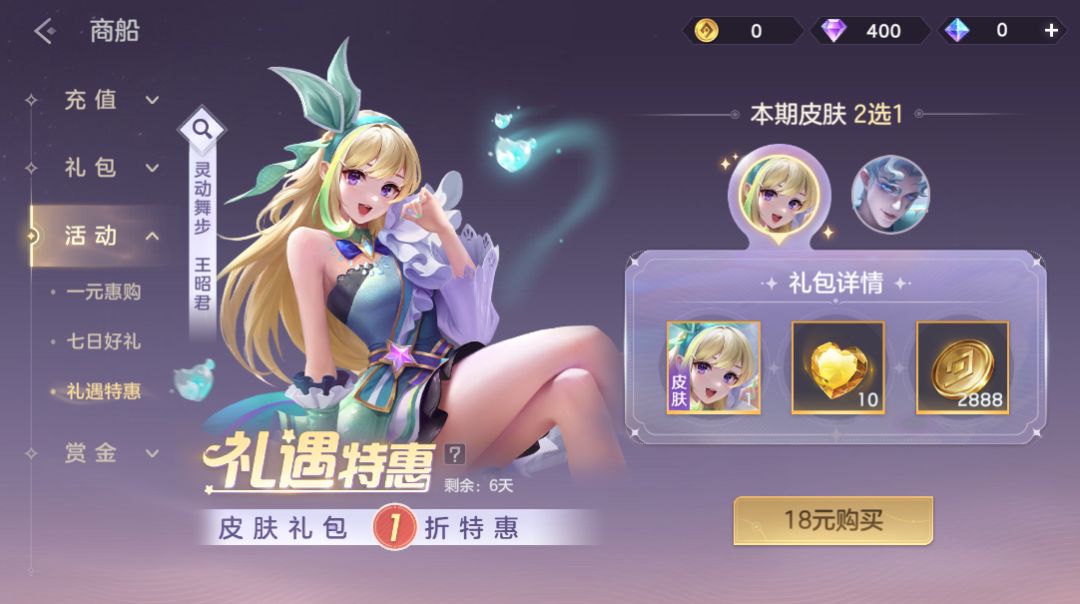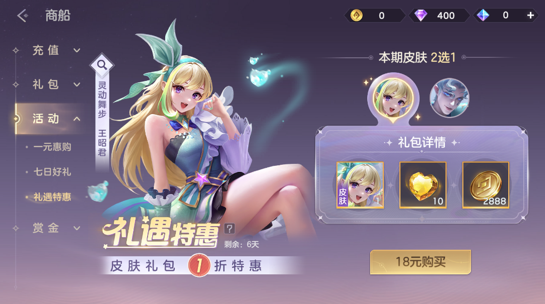礼遇皮肤礼包限时1折,王昭君·灵动舞步、伏羲·奇迹大师超值2选1。