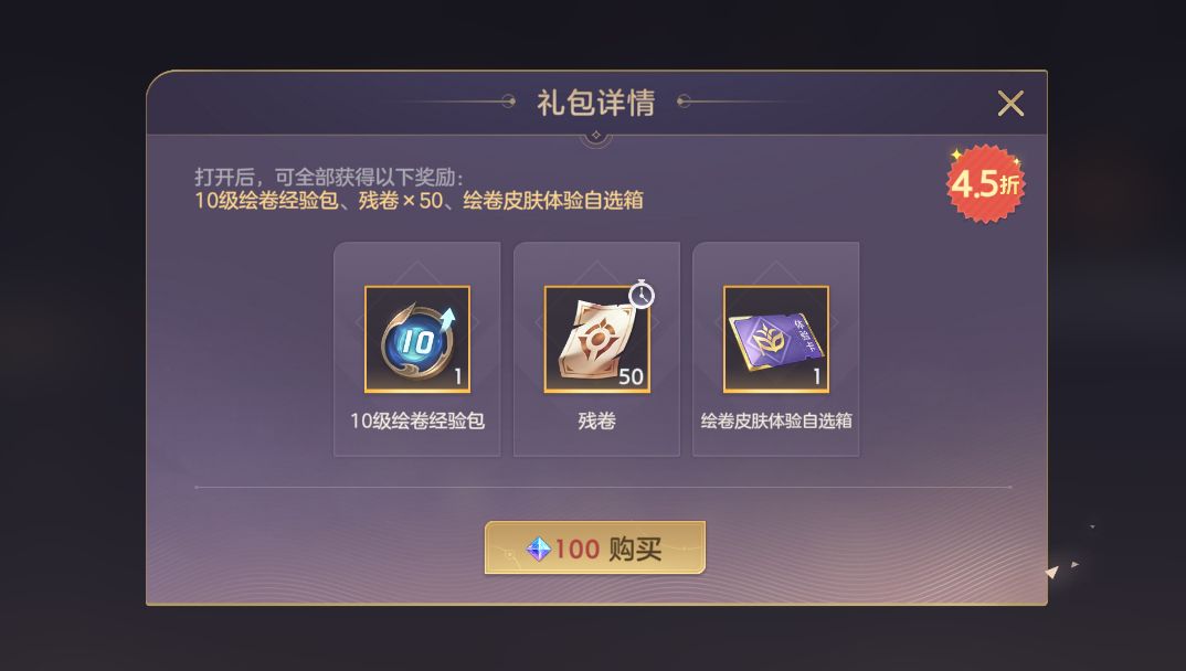 绘卷礼包限时开售,礼包内含10级绘卷经验包、残卷*50、绘卷皮肤体验自选箱。