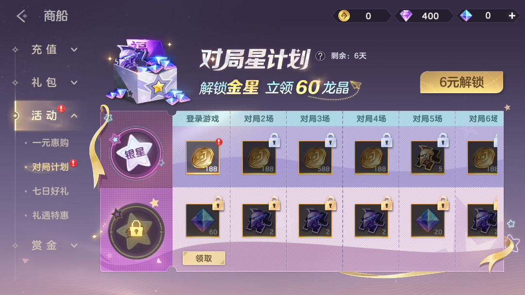 完成对局任务,提升等级免费获取英雄碎片、金币;付费6元解锁金星可以获得龙晶*120、龙魂祈福卡、皮肤碎片。