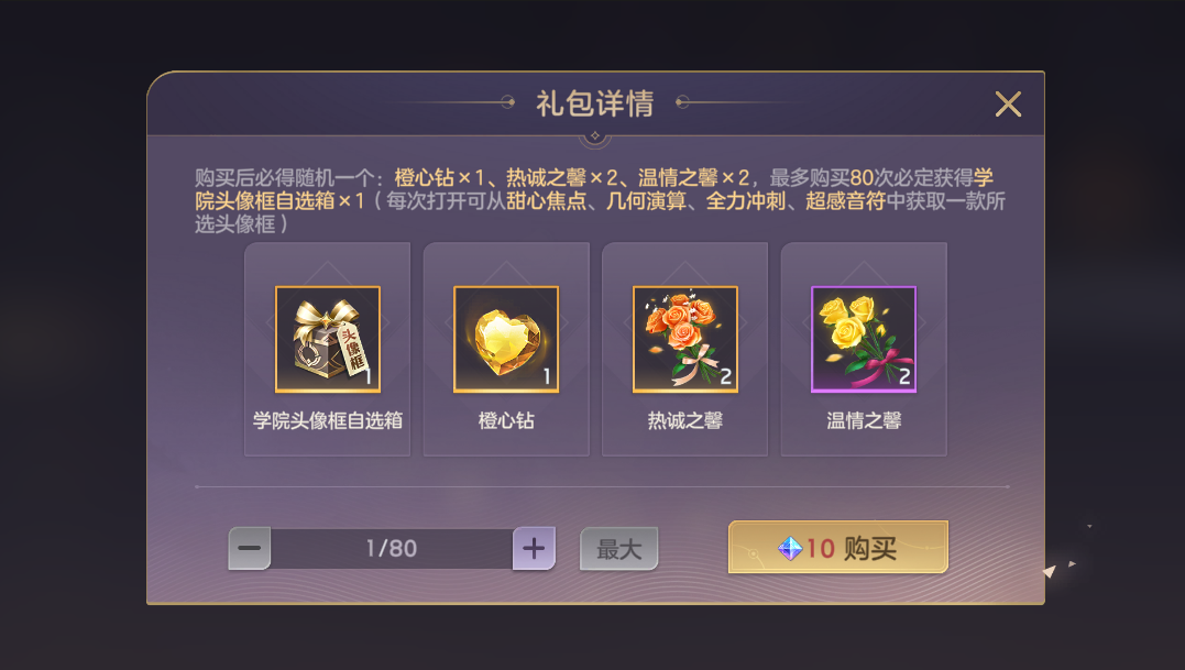 学院秘宝限时售卖,每抽可得任意奖励:橙心钻*1、热诚之馨*2、温情之馨*2,最多购买80次必定获得学院头像框自选箱(内含甜心焦点、几何演算、全力冲刺、超感音符头像框)。