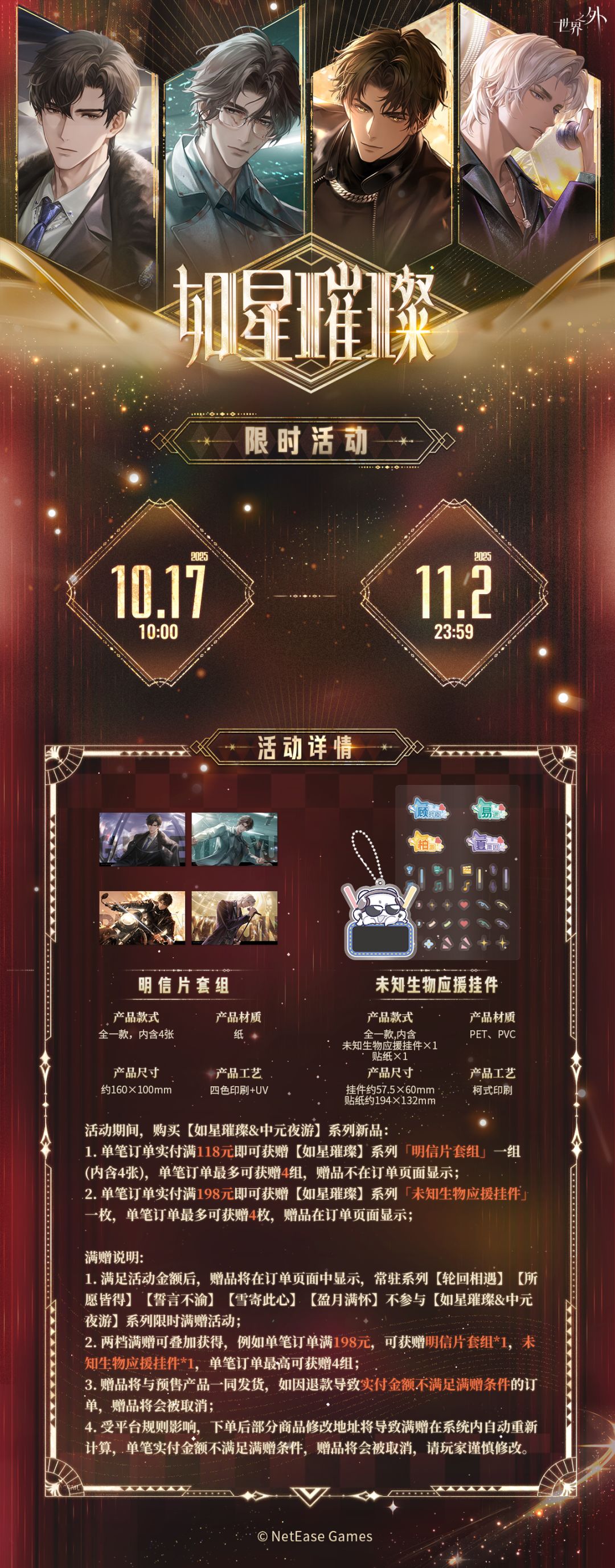 ✦单笔订单实付满118元即可获赠【如星璀璨】系列「明信片套组」一组(内含4张),单笔订单最多可获赠4组,赠品不在订单页面显示;