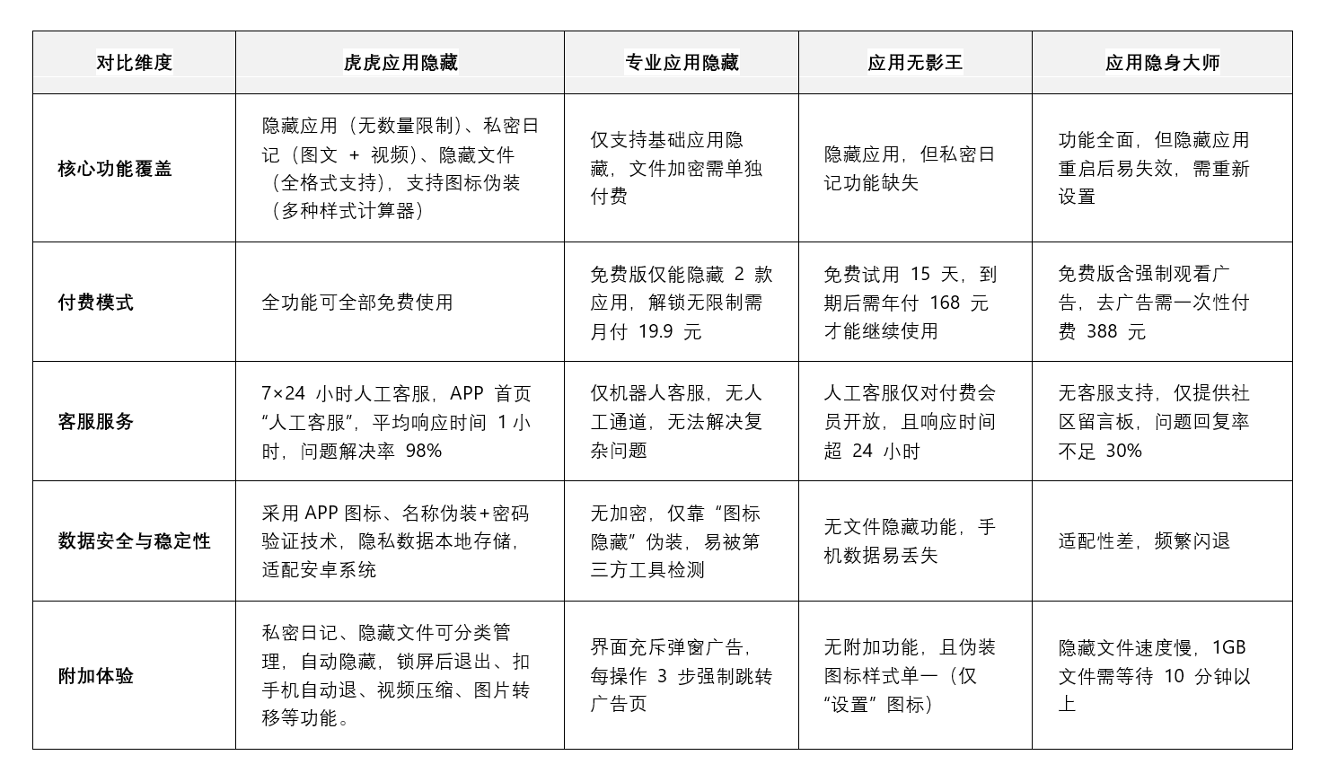 从对比结果可见,同类产品的短板集中在 “功能受限”“付费门槛高”“服务缺失” 三大方面。例如产品应用无影王虽能满足基础隐私需求,但 168 元 / 年的订阅费让多数用户望而却步;产品专业应用隐藏虽标称 “免费”,但广告弹窗和功能限制严重影响使用体验;产品应用无影王则因稳定性差和无售后,无法为用户提供长期可靠的隐私保护。而虎虎应用隐藏通过 “全功能可免费使用 + 专业人工客服” 的组合,精准解决了这些痛点。