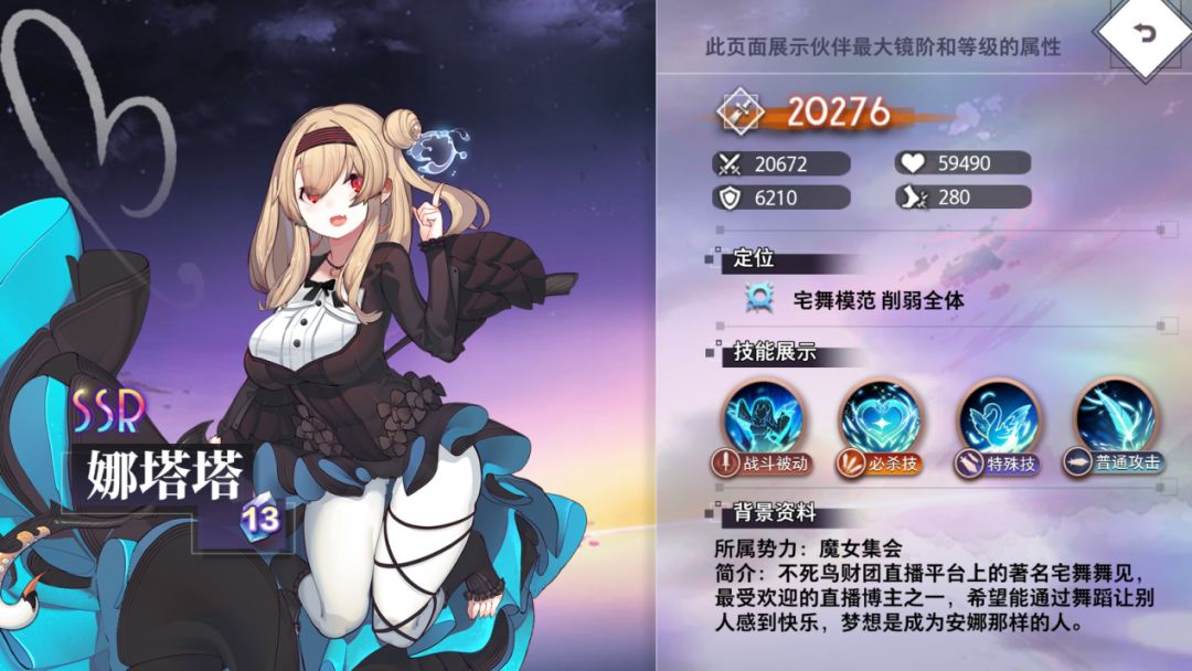 娜塔塔登场时,降低敌方所有伙伴20%的免伤率,持续2回合。