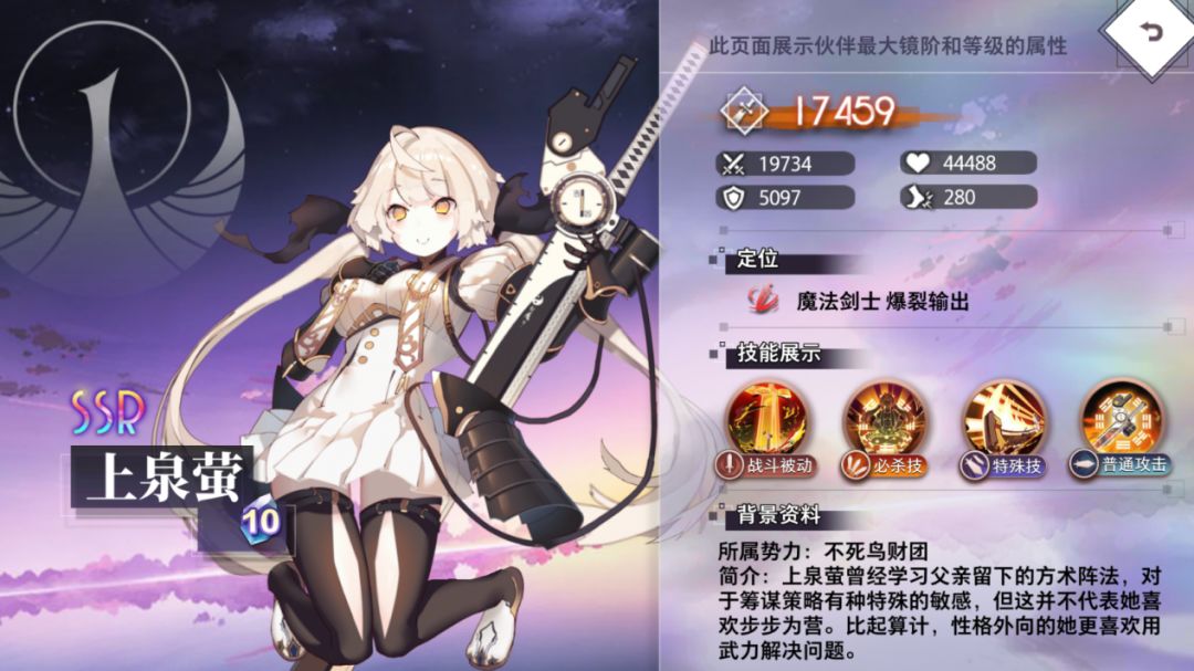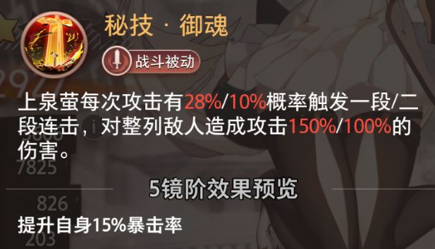 上泉萤每次攻击有28%/10%概率触发一段/二段连击,对整列敌人造成攻击150%/100%的伤害。