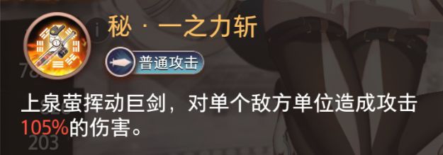 上泉萤挥动巨剑,对单个敌方单位造成攻击105%的伤害。