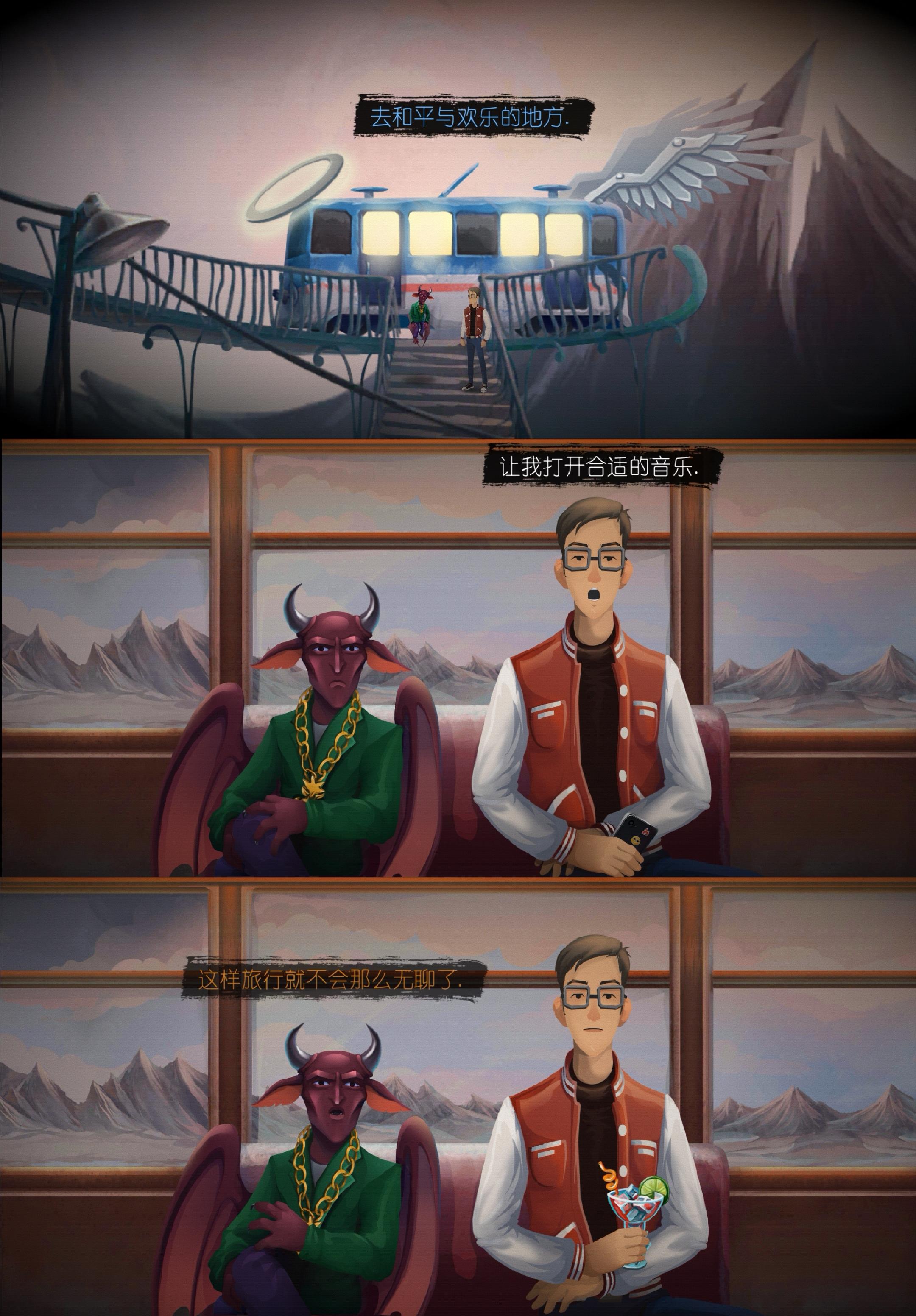 游戏原名Angelo and Deemon: One Hell of a Quest,算是剧情解谜类游戏。讲的是博主安吉洛因为死神工作失误,阴差阳错决定去地狱探索,为自己的短视频创作增加素材和看点。他和恶魔模样的狄蒙组成搭档,共同开启地狱之旅。在地狱,他遇到了摩托车手本、政治家P先生、铁道旁的怪人、脑袋有洞的酒鬼、寒风中打坐的东方男人、魔鬼维德拉、地毯状的CEO、意识流黑客……在和他们交流的过程中,安吉洛知道了他们的故事和愿望,也尽力帮助他们达成。最终,安吉洛和狄蒙回到中转站,乘上了去往天堂的列车。