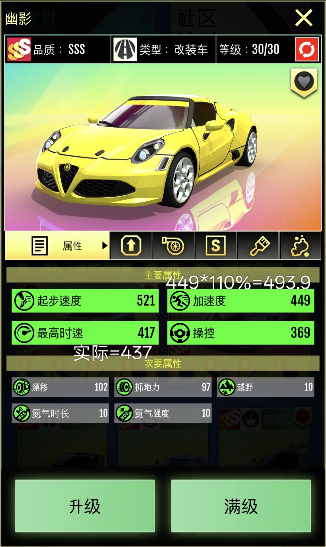 面板极速442,触发特性后487,约等于增加了10%的极速,所以,由此我们可以分析幽影的实际加速度。