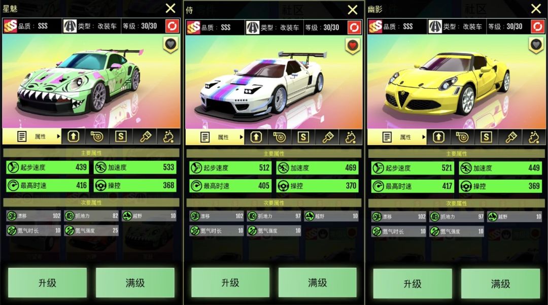 三辆车零件搭配均为蓝红蓝红,涡轮电控的词条搭配,星魅和幽影选择双起步,侍选择一起步一加速,涡轮电控第二个词条都是选择极速。