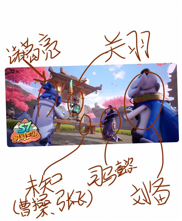 还有这张图片,让我有了很大的猜想。这张图片是三位三国英雄(关羽 刘备 张飞)结交的地方,按照心动每次更新赛季的套路。都会围绕每个主题来开展(比如:s1皮皮马戏团,都以马戏为体材)。按照这样往下猜就会得出结论,有这几个英雄可能会纳入:刘备、关羽、张飞、曹操这四位大将,后面的就毫无音序。