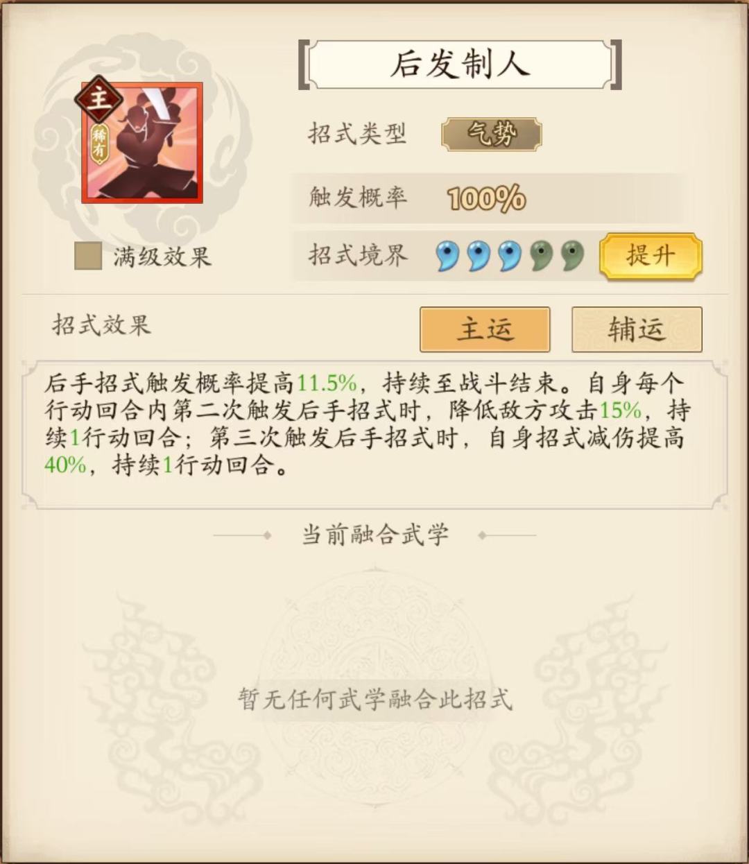 依靠白马青牛与奇门武学的联动,实现功能+输出的双线程布局,使阴奇门的资源利用率得到了保障,那么安全性和流畅性呢?重中之重的核心来了,那就是后发制人。在一步登天弱化的现版本想登人基本可以忽略,我们可以大胆的主运后发制人以获得满级高达12.5%的后手触发率,15%的攻击降低,40%招减。这三个数字是什么概念,相当于一个招式位换取高达20件以上的装备特效加持(相当于带了5个后起、13个坚固外加5个中级震慑)