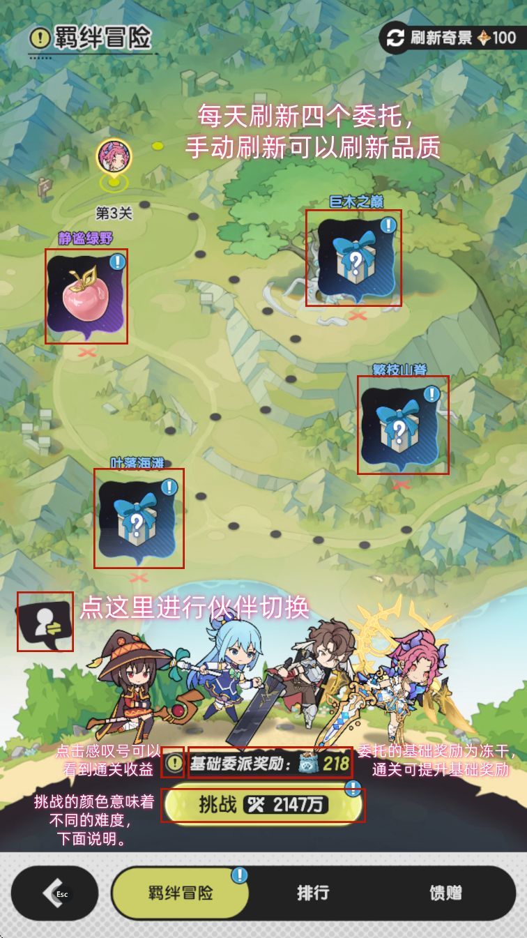2【羁绊冒险】是新的爬塔模式,在以前爬塔的基础上,增加了和伙伴一起战斗的功能。【羁绊冒险】是和自己的3个【伙伴】一起挑战关卡。挑战关卡成功后,会提高做委托获得的奖励。不仅要考验,技能搭配,也要考虑伙伴带的技能是否合适。刚开始搭配的时候要多看看伙伴的技能,每个伙伴的技能都不一样,流派也不一样,没有最对的只有最合适的。