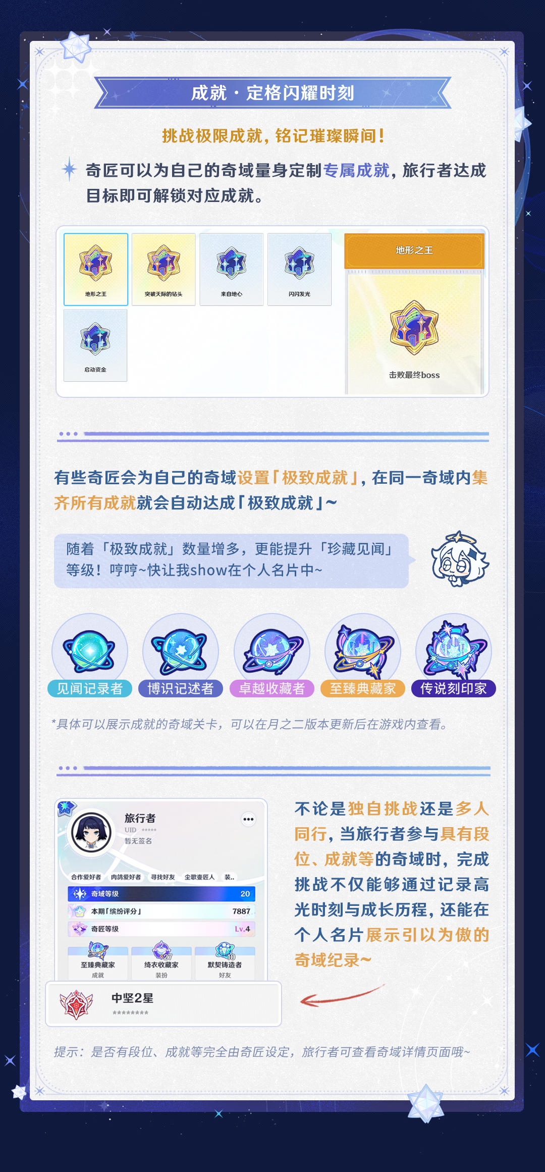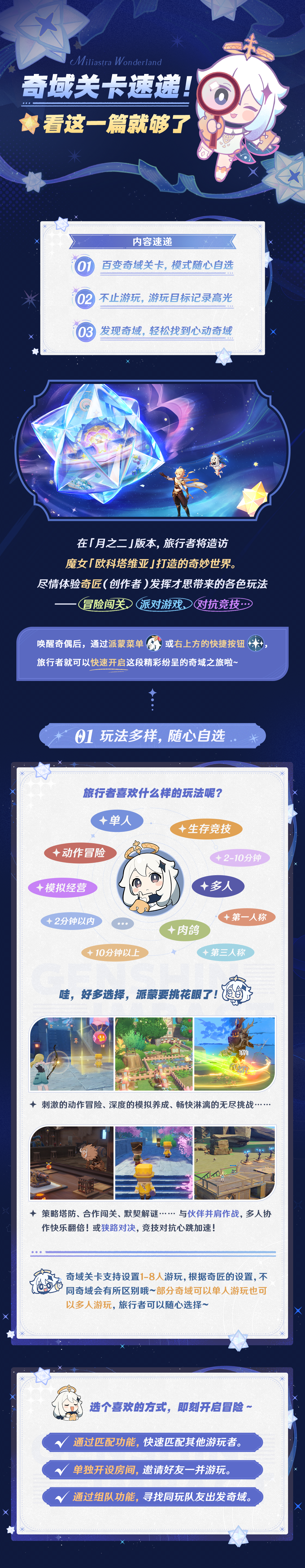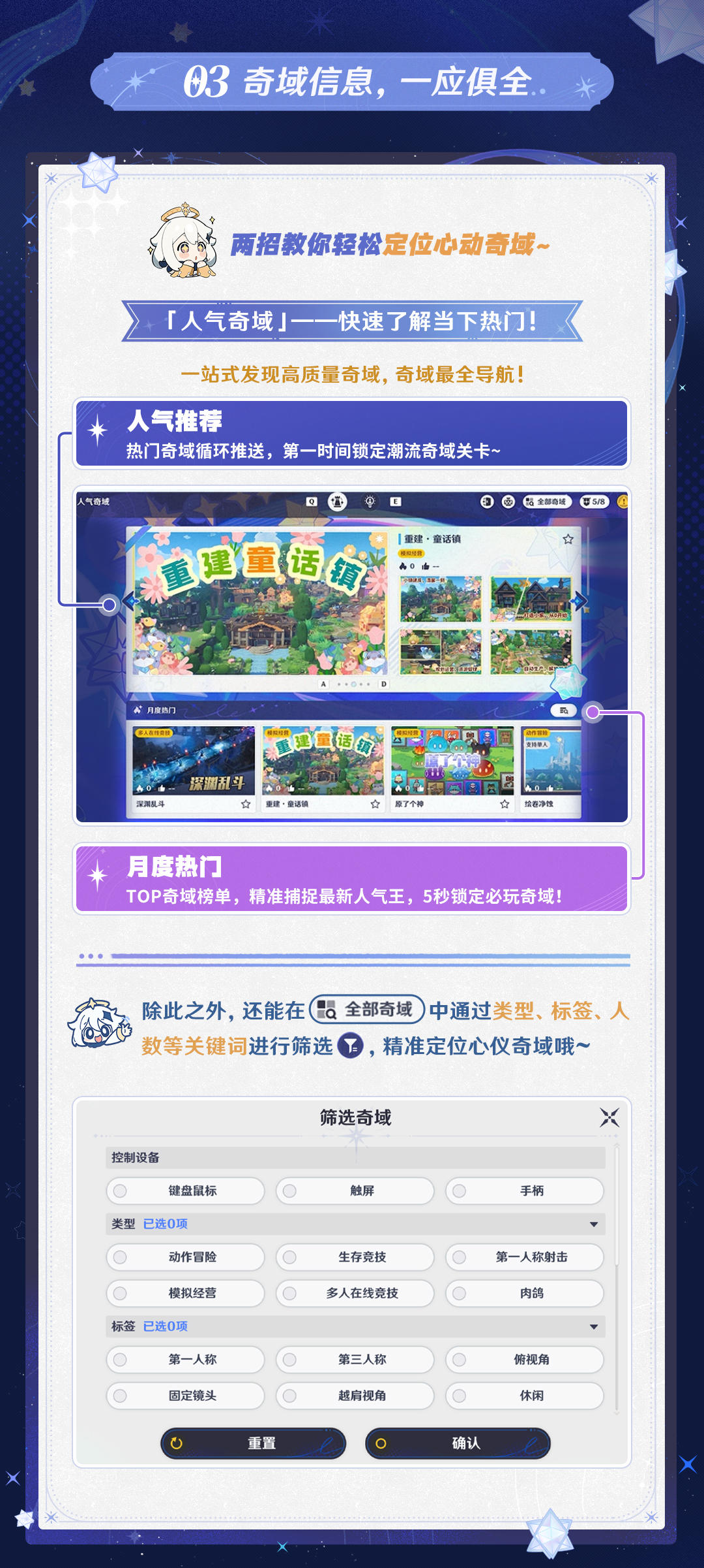在「千星奇域」汇聚着奇匠创作的风格迥异的奇域关卡——紧张刺激的动作冒险、自由创作的模拟经营、热血沸腾的多人在线竞技、轻松愉快的休闲合作、益智精妙的解谜探索....百变奇域关卡等你来战,多样化挑战方式任你挑选,即刻开启你的体验之旅吧~