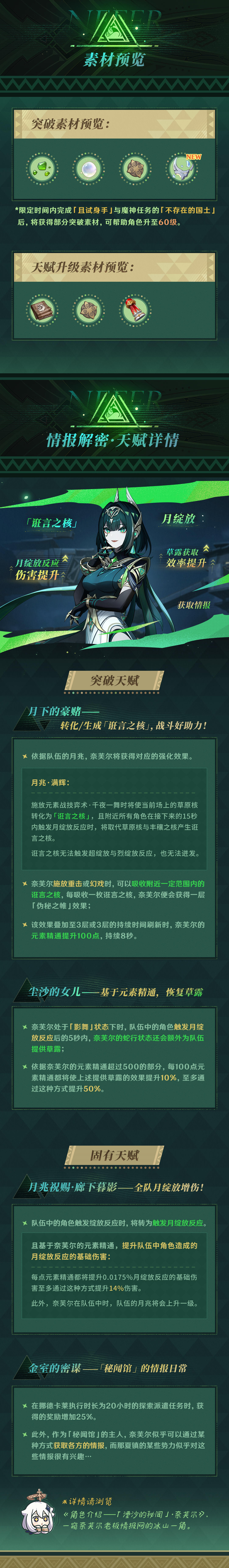 旅行者好呀,接下来为大家带来奈芙尔老板的机密战斗情报,一起来看看吧~「赤砂的诱言」活动祈愿将于10月22日开启——「湮沙的秘闻·奈芙尔(草)」的祈愿获取概率将大幅提升!